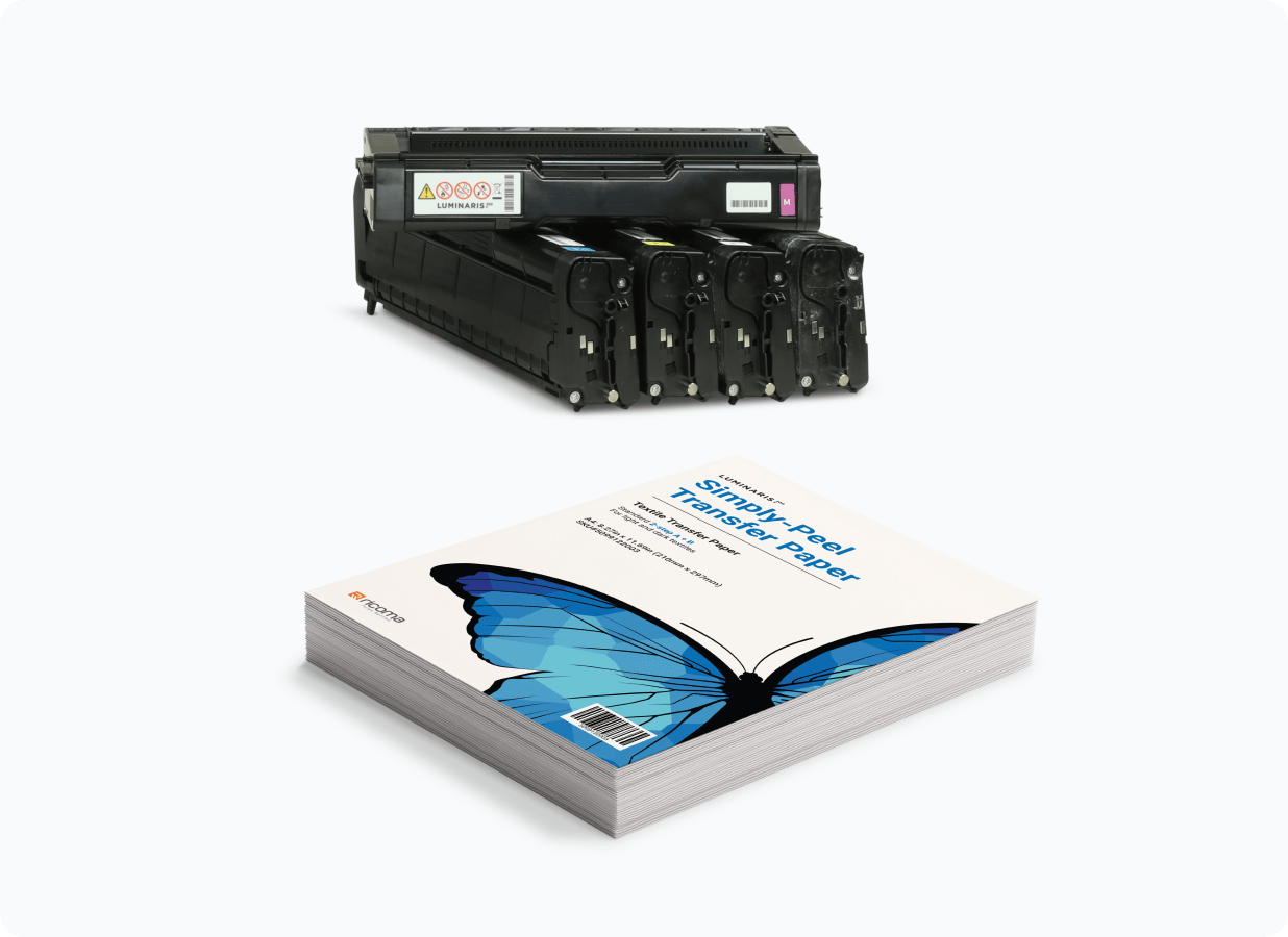 Equipped with its high-quality white toner, Ricoma’s Luminaris 200 can print full-color designs for a wide variety of dark and light substrates without leaving any messy ink behind.